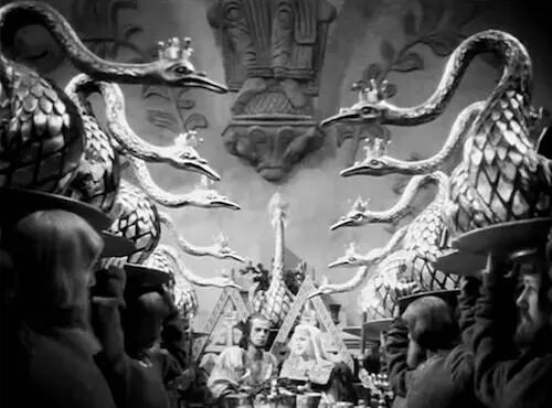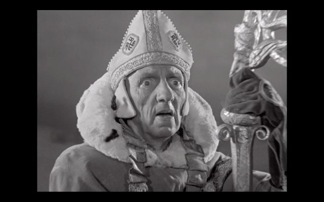 但是对于爱森斯坦来说,这部电影并不是超前的而是“出神的”(ekstasis)——指的是那些在艺术作品中被提升和自我放大的情感作用,比如第二部分的结尾。这可以在沙皇禁苑那场以死亡为主题的舞蹈中清楚地反应出来,这是一场关于颜色、节奏、运动、音乐和歌曲的爆炸性实验,这意味着一种血与火的传统,也将沙皇禁苑描绘成了一股堕入地狱的力量。